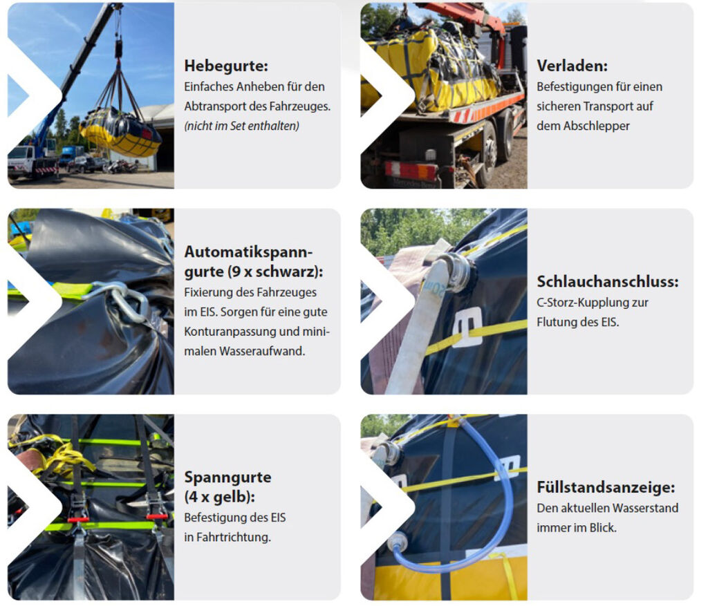 Mit dem E-Vehicle Isolation System der Fa. Vetter ist eine dauerhafte und sichere Kühlung, sowie die kompakte Aufbewahrung des ausgebrannten E-Autos möglich. Nach der erfolgreichen Löschung des Fahrzeuges wird das sogenannte EIS am Fahrzeug angebracht und geflutet. Sobald sich die komplette Batterieeinheit unter Wasser befindet, kann das Fahrzeug vom Abschleppdienst angehoben, abtransportiert und bis zur Endverwertung im EIS aufbewahrt werden.